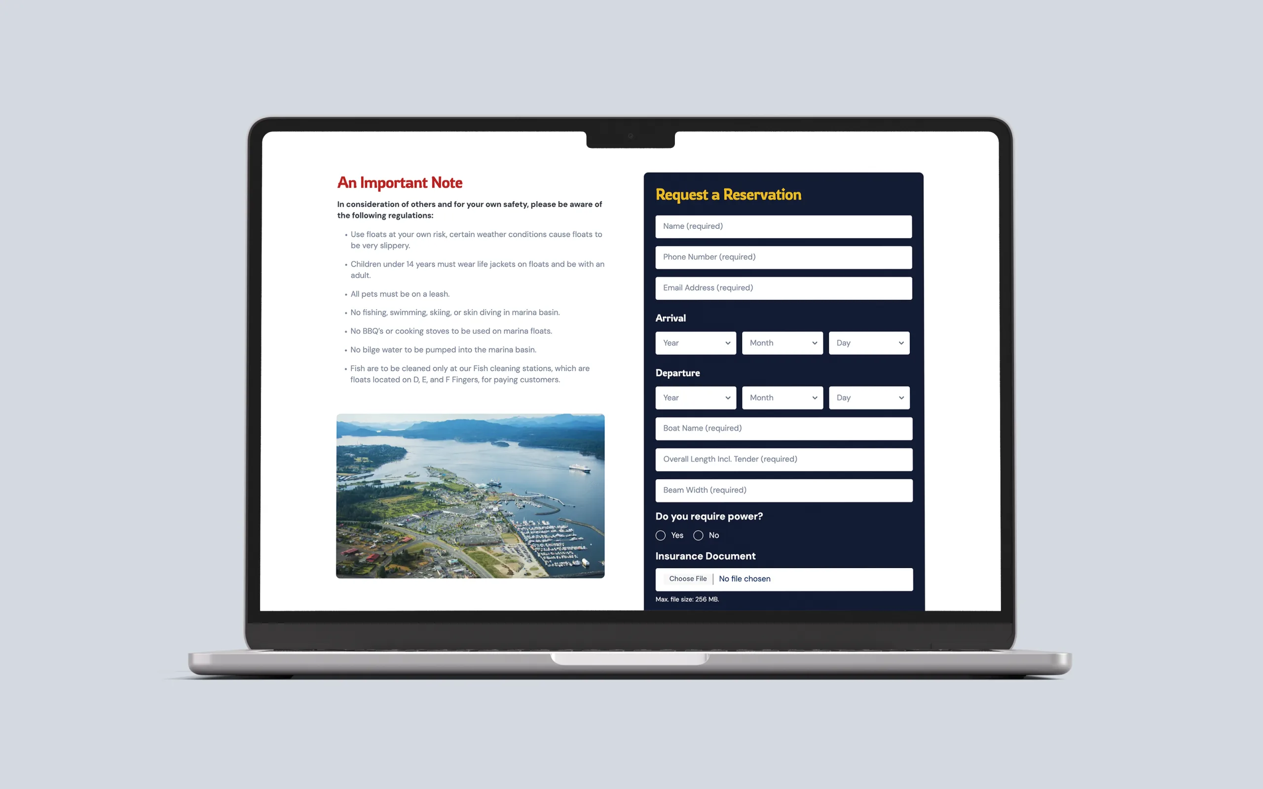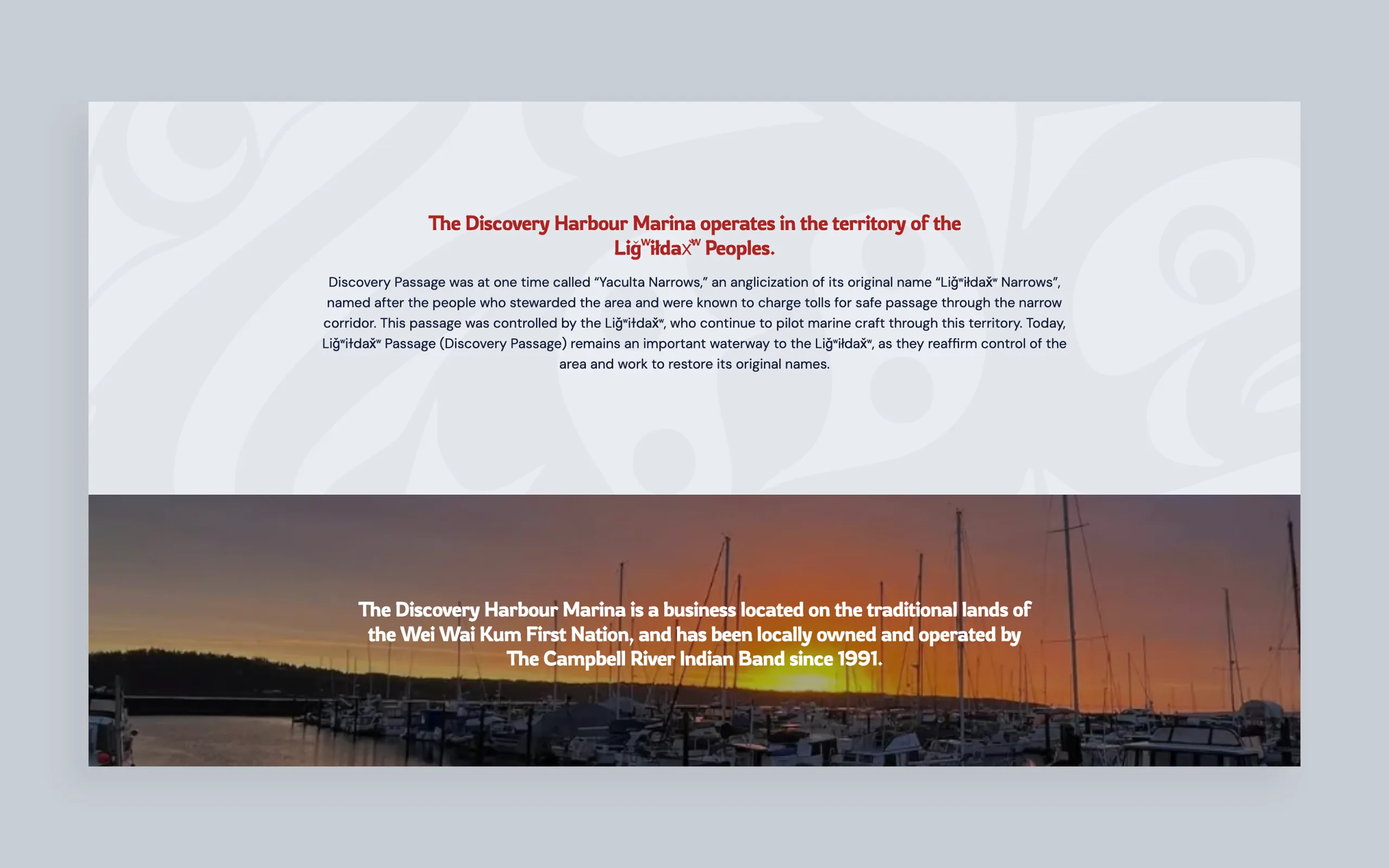 Beyond function, we ensured the site recognizes its Indigenous ownership by featuring a prominent land acknowledgement that shares the history of Liǧʷiɫdax̌ʷ Passage (Discovery Passage), creating a digital experience that is both efficient for boaters and authentically connected to the community.