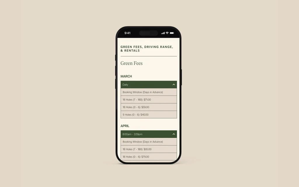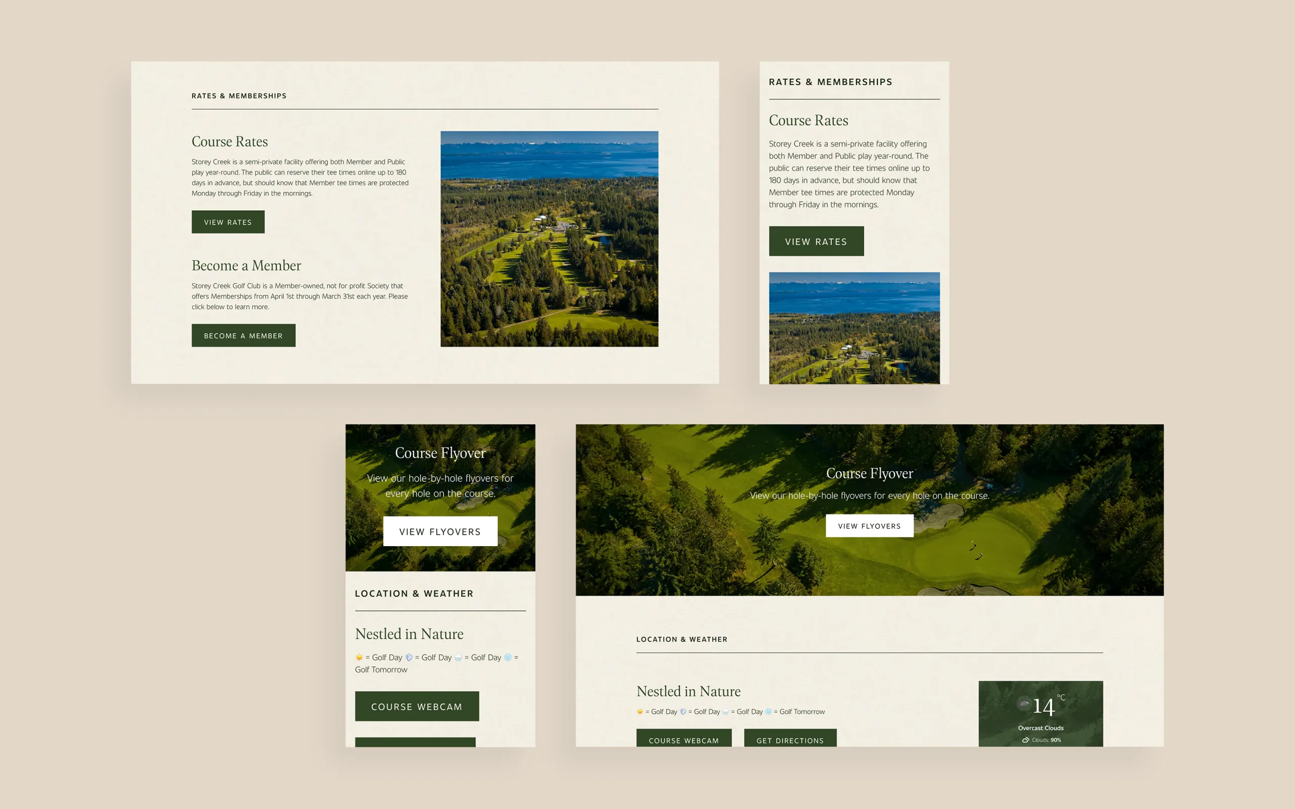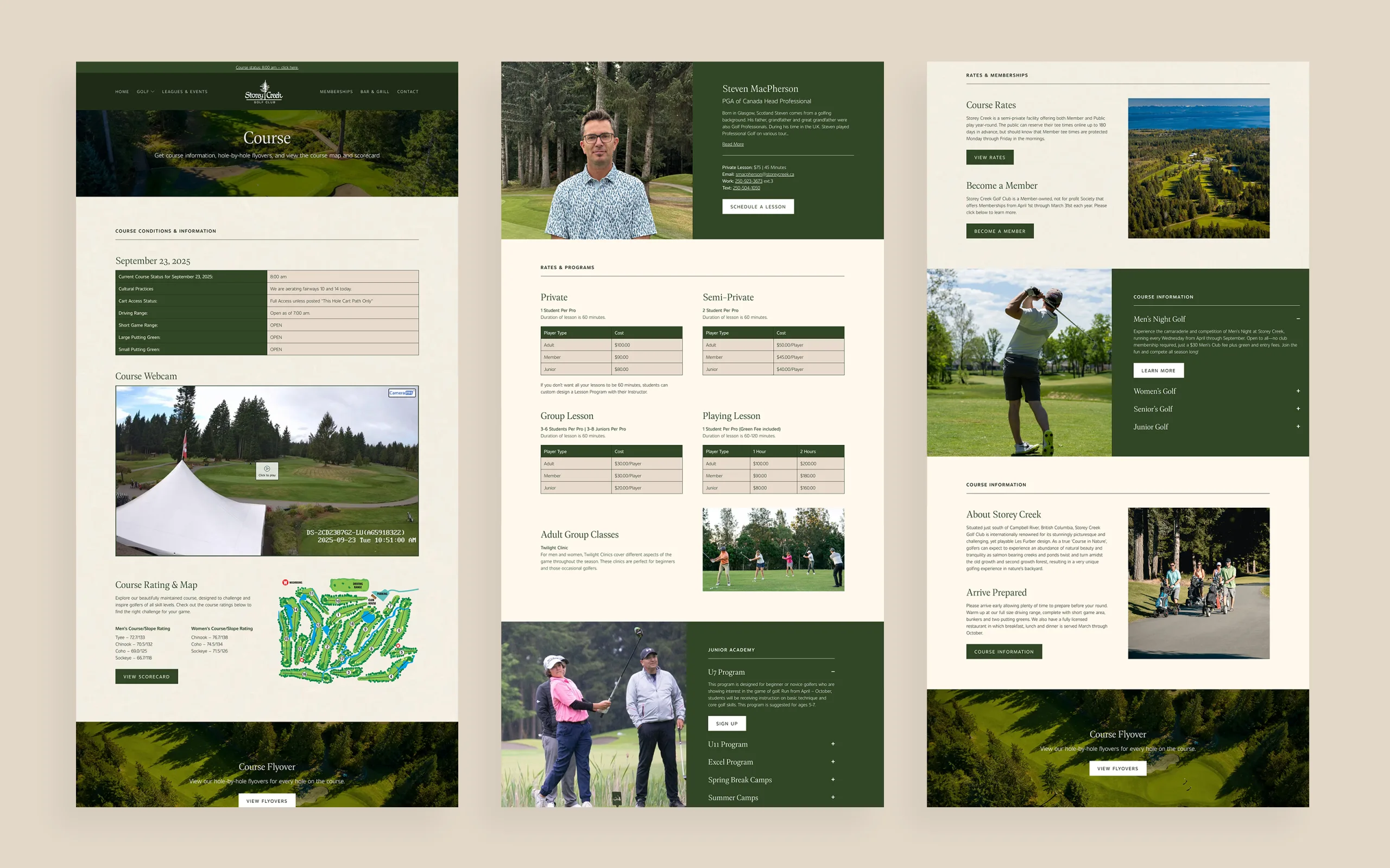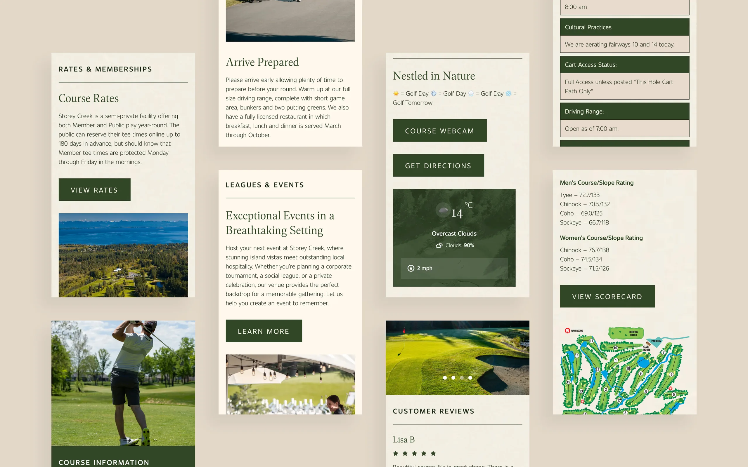 For Storey Creek Golf Club, we began the website redesign by fully rethinking the site’s structure—untangling outdated pathways and rebuilding the sitemap into a clean, intuitive framework. We prioritized what members, visitors, and event organizers need most, from tee time bookings to course info and tournament registration. With the foundation set, we brought the structure to life in Figma through responsive mobile and desktop layouts that blend intuitive UX with visuals inspired by the natural beauty of the course.